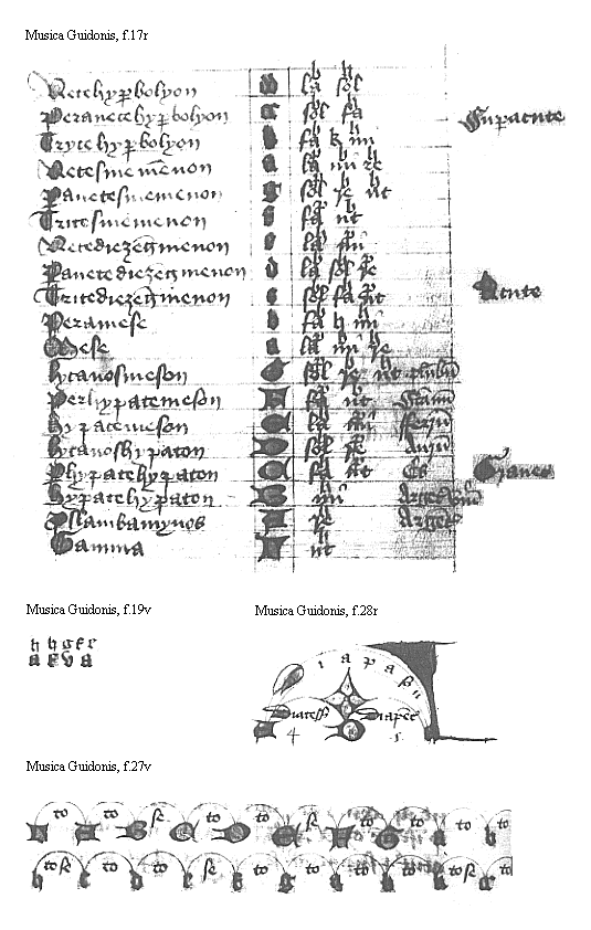 [Musica Guidonis, f.17; text: Superacute, Acute, Graues, [Gamma], A, B, C, D, E, F, G, a, b, c, d, e, f, g, aa, bb, cc, dd, ut, re, mi, fa, sol, la, [sqb], pro, Plumbum, Stannum, Ferrum, Aurum, Es, Argentum viuum, Argentum, Netehyperbolyon, Peranetehyperbolyon, Trytehyperbolyon, Netesinnemmenon, Peranetesinnemenon, Tritesinnemenon, Netediezeugmenon, Peranetediezeugmenon, Tritediezeugmenon, Peramese, Mese, Lycanosmeson, Perhypatemeson, Hypatemeson, Lycanoshypaton, Perhypatehypaton, Hypatehypaton, Proslambamynos, Gamma] [ANOGUI 02GF]