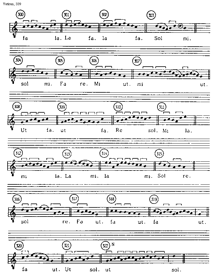 [Vatican, 339; text: fa la. La fa. Sol mi. Fa re. Mi ut. Ut fa. Re sol. Mi la. La mi. Sol re. Fa ut. Ut sol.] [ARSORG 35GF]