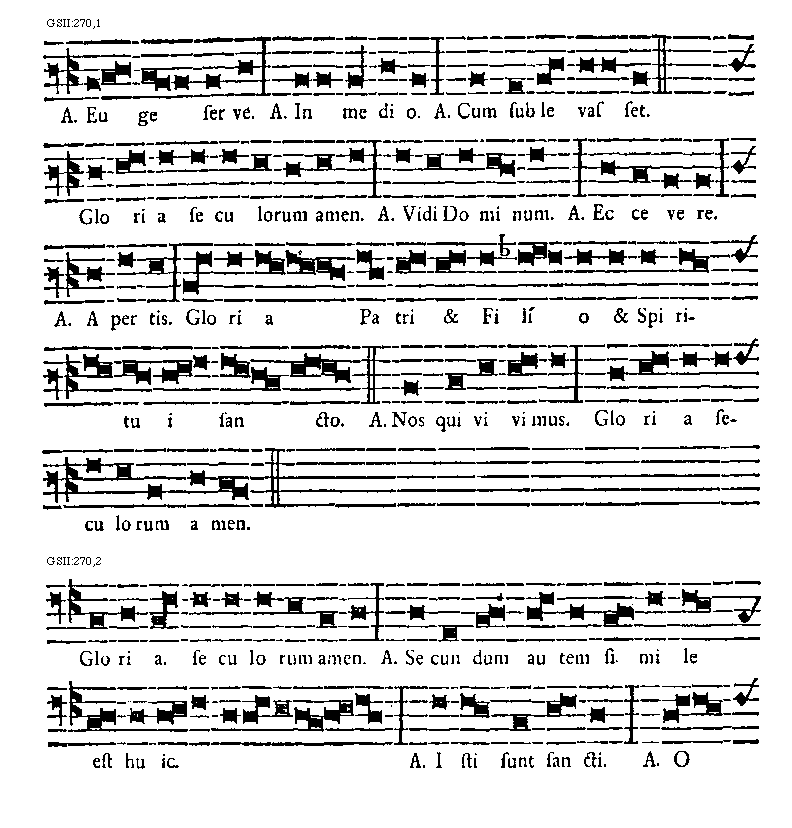 [270] [GSII:270,1; text: Antiphona Euge serve. Antiphona In medio. Antiphona Cum sublevasset. Gloria seculorum amen. Antiphona Vidi Dominum. Antiphona Ecce vere. Antiphona Apertis. Gloria Patri et Filio et Spiritui sancto. Antiphona Nos qui vivimus.] [BERTON 02GF]