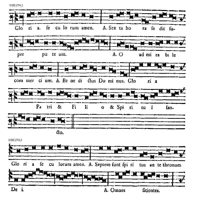 [GSII:274,2; text: Gloria seculorum amen. Antiphona Septem sunt spiritus ante thronum Dei. Antiphona Omnes sitientes.] [BERTON 06GF]