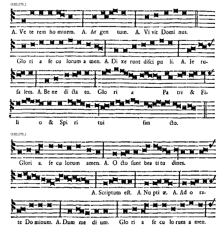 [275] [GSII:275,1; text: Antiphona Veterem hominem. Antiphona Argentum. Antiphona Vivit Dominus. Gloria seculorum amen. Antiphona Dixerunt discipuli. Antiphona Ierusalem. Antiphona Benedicta tu. Gloria Patri et Filio et Spiritui sancto.] [BERTON 07GF]