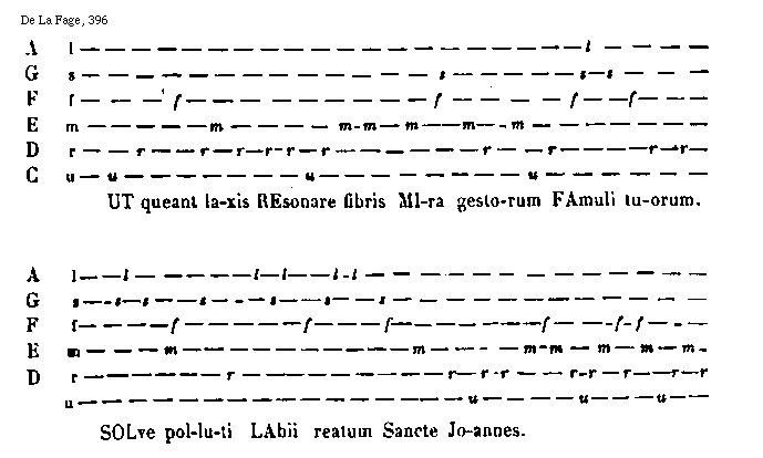 [De La Fage, 396; text: A, G, F, E, D, C, u, r, m, f, s, l, UT queant laxis REsonare fibris MIra gestorum FAmuli tuorum. SOLve polluti LAbii reatum Sancte Johannes.] [JOAMUS 01GF]