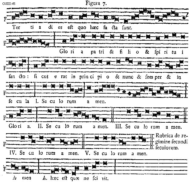 De istis quinque seculorum debemus scire, quod tertium seculorum praevalet punctum, et optime et competenter posset regere omnes cantus tertii toni, et nullum aliud seculorum eiusdem toni ad istud faciendum idoneum reputatur. Ad [47] aliam disputationem super isto ad praesens non procedo. Sed ista et alia, quae possent notari circa naturam eorum, quae dicta sunt de tertio tono, satis possunt colligi per ea, quae dicta sunt in primo. Tertium tonum et quartum in figura non pono; sed tu minor, si placuerit, fac reponi ad instar figurae primi et secundi. Item diffinitiones tertii toni et quarti possunt per diffinitiones primi et secundi haberi, litteris, in quibus incipiunt et finem faciunt, observatis. De primo seculorum de Gloria patri non curavi dare proprium regimen: nam totaliter cum neumate de fine regit idem, quod seculorum secundum, quod finit in E. aut sine aliquo neumate, sed de seipso regit in totum idem quod tertium seculorum. Et nota tu minor, ad cuius instantiam condo tonos, quod si traderes mihi libros usitatos de episcopatu tuae dioecesis, libenter colligerem ex ipsis principia cantuum, et reponerem in tonos pro exemplis, ut per exercitum cantuum in exemplis positorum facilius tractu temporis cantus disceres, et efficacius memoriae commendares. Nec mireris, quod non duplico seu multiplico exempla: nam illa multiplicatio non cederet nisi ad confusionem et retardartionem scolasticae doctrinae, et illa multiplicatio, quam multi faciunt, videtur quod procedat ex artis ignorantiae caecitate. Et nota, quod sub exemplis, quae pono, intendo comprehendere exempla omnium cantuum, qui concorditer per quemcumque cantari possunt. Et sub seculorum regulis limitari.