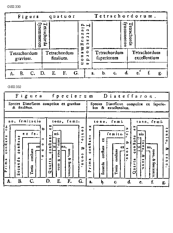 [GSII:332; text: Figura specierum Diatessaron. Species Diatessaron compositae ex gravibus et finalibus. A. B. C. D. E. F. G. Prima constans tono, semitonio et tono. Prima constans ex tono, semitonio, et tono. Secunda constans ex semitonio, tono et tono. Secunda constans ex semitonio tono, et tono. Tertia constans ex tono, tono, et semitonio. Quarta constans ex tono, semitonio, et tono. Species Diatessaron compositae ex superiobus et excellentibus. a. [sqb]. c. d. e. f. g.] [ENGDEM3 01GF]