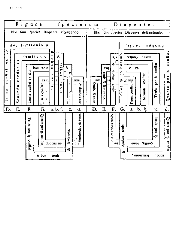 Licet ergo omnes species diatessaron et diapente in praedictis locis suae generationis habeant quodammodo naturales, id est, tonales sedes suas, nihilominus tamen extra praedicta loca etiam generantur. Nam a D. sol, re, in G. sol, re, ut. invenitur etiam diatessaron constans ascendendo ex tono et semitonio et tono, quae est prima species diatessaron. Similiter a C. fa, ut,, in G. sol, re, ut invenitur species [334] diapente constans ex duobus tonis et semitonio et tono ascendendo, et e contrario descendendo alia species opposita. Est enim regula generalis, quod in omnibus speciebus diatessaron et diapente ascensus e contrario habet se ad descensum secundum ordinem tonorum et semitoniorum, ex quibus constat unaquaeque species, praeter primam speciem diatessaron, ubi similis est ascensus et descensus per tonum et semitonium, et tonum, et sic eadem species. Unde patet, quod ascensus et descensus non faciunt easdem species, sed oppositas, praeterquam in sola prima specie diatessaron. Unde notandum, quod ultimae et mediae species diatessaron et diapente ad invicem opponuntur: quia intensio primae est remissio quartae, et ascensus secundae est descensus tertiae speciei.