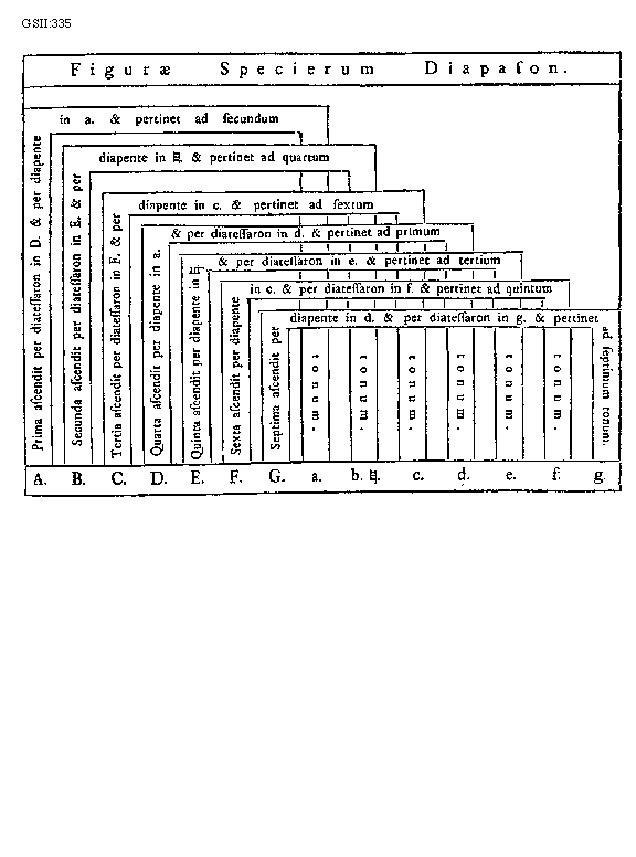 [GSII:335; text: Figurae Specierum Diapason. A. B. C. D. E. F. G. a. b. [sqb]. c. d. e. f. g. Prima ascendit per diatessaron in D. et per diapente in a. et pertinet ad secundum tonum. Secunda ascendit per diatessaron in E. et per diapente in [sqb]. et pertinet ad quartum tonum. Tertia ascendit per diatessaron in F. et per diapente in c. et pertinet ad sextum tonum. Quarta ascendit per diapente in a. et per diatessaron in d. et pertinet ad primum tonum. Quinta ascendit per diapente in [sqb]. et per diatessaron in e. et pertinet ad tertium tonum. Sexta ascendit per diapente in c. et per diatessaron in f. et pertinet ad quintum tonum. Septima ascendit per diapente in d. et per diatessaron in g. et pertinet ad septimum tonum.] [ENGDEM3 03GF]