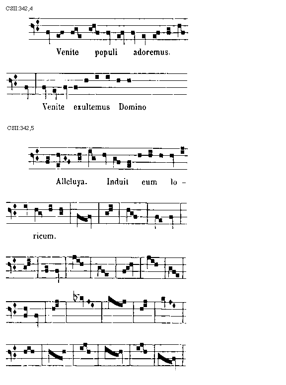 [CSII:370,2; text: Alma. Nazareus vocabitur. Descendendi. Ante tronum. Paganorum. Cur transfixet. Dominus. Evovae.] [JACSM6B 107GF]