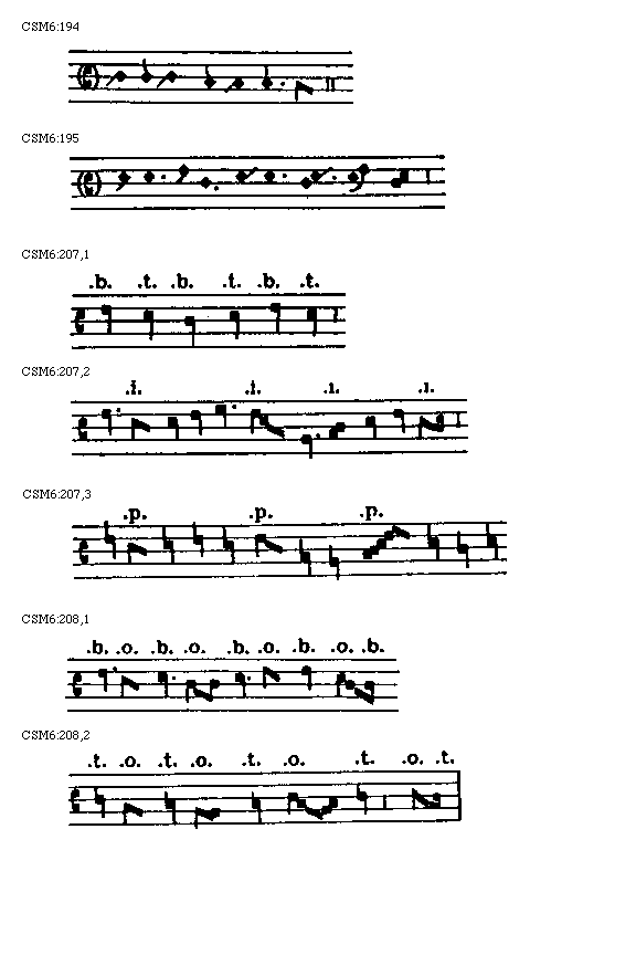[207] Si vero unus cantus proportionaretur ex longis perfectis, puta sic quod una cantaretur de tempore perfecto et alia de imperfecto, et sic deinceps, dicimus quod supra notas temporis perfecti ponatur .t., innuens ipsam pertinere ad ternariam divisionem, quae proprie est temporis perfecti; supra vero notas temporis imperfecti ponatur .b., innuens binariam divisionem, quae pertinet solum ad tempus imperfectum, ut hic: