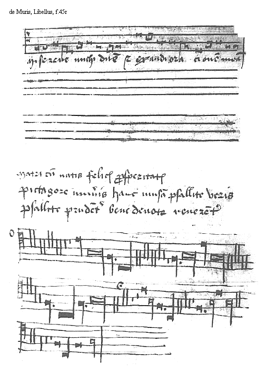 [f.45r] [de Muris, Libellus, f.45r; text: miserere michi domine et exaudi oracionem meam, matri cum natis felicis prosperitatis, pictagore numeris hanc musam psallite veris, psallite prudenter bene deuote reuerenter m.sec.] [MURLIBR 08GF]