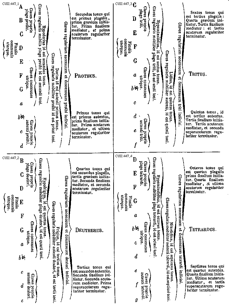 Octo sunt toni musicales quibus omnis cantus regulatur; quorum quatuor primo inventi fuerunt ab antiquis, reliqui vero a posteris; quatuor enim tonos dicitur grecos invenisse quibus ipsi imposuerunt hec nomina: Prothus, Deuterus, Tritus et Tetrardus; qui latino sermone interpretantur primus, secundus, tertius, quartus.