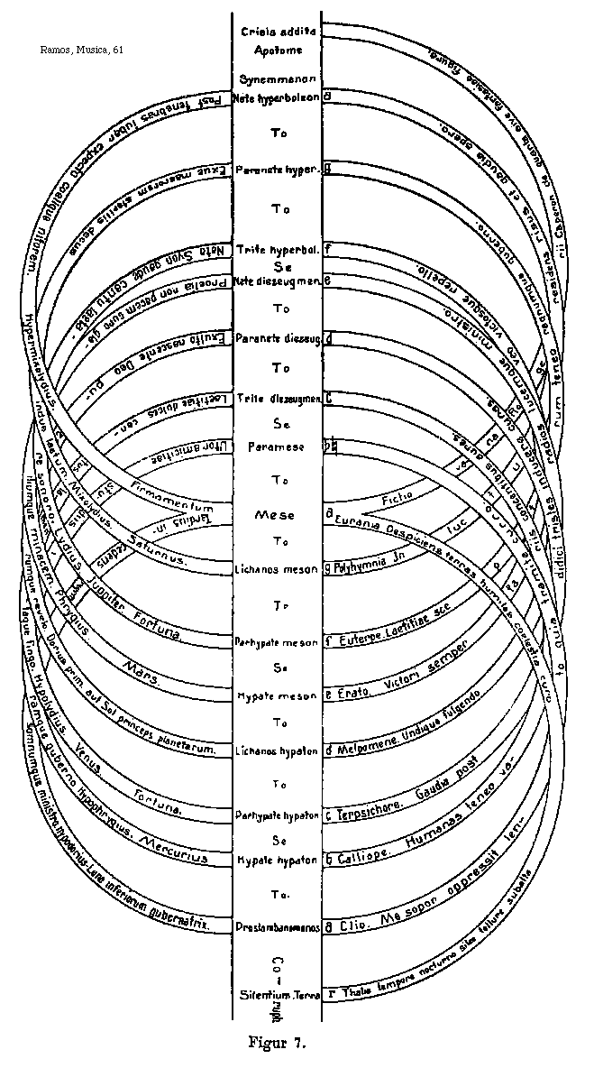 [61] [Ramos, Musica, 61; text: Figur 7. Crisis addita, Apotome, Tonus, Semitonium, Coruph, Synemmenon, Nete hyperboleon, Paranete hyperboleon, Trite hyperboleon, Nete diezeugmenon, Paranete diezeugmenon, Trite diezeugmenon, Paramese, Mese, Lichanos meson, Parhypate meson, Hypate meson, Lichanos hypaton, Parhypate hypaton, Hypate hypaton, Proslambanomenos, Silentium. Terra, [Gamma], a, b, c, d, e, f, g, [rob][sqb], Fictia vana Rogerii Caperon de quarta sive fantasiae figura. Polyhymnia. In luctu residens risus et gaudia spero. Euterpe. Laetitiae sceptrum teneo regnumque guberno. Erato. Victori semper faveo victosque repello. Melpomene. Undique fulgendo radios lucemque ministro. Terpsichore. Gaudia post didici tristes inducere curas. Calliope. Humanas teneo variis concentibus aures. Clio. Me sopor oppressit lento quia tramite curro. Thalia tempore nocturno sileo tellure subalta, Eurania. Despiciens terras humiles coelestia curo. Post tenebras iubar expecto coelique nitorem. Hypermixolydius. Firmamentum. Exue maerorem sterilis decus indue laetum. Mixolydius. Saturnus. Nata Syon gaude cantu laetare sonoro. Lydius. Juppiter. Fortuna. Proelia non pacem curo gladiumque minacem. Phrygius. Mars. Exulto nascente Deo puerumque revelo. Dorius primus aut Sol princeps planetarum. Laetitiae dulces cantus lamentaque fingo. Hypolydius. Venus. Utor amicitiae studius iramque guberno. Hypophrygius. Mercurius, Tardius incedens regem somnumque ministro. Hypodorius--Luna inferiorum gubernatrix.] [RAMMP 06GF]