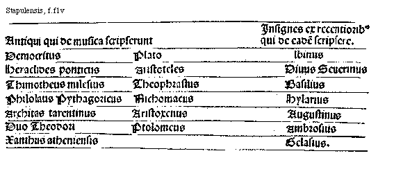 [Stapulensis, f.f1v; text: Antiqui qui de musica scripserunt, Insignes ex recentioribus qui de eadem scripsere. Democritus, Plato, <A>lbinus, Heraclides Ponticus, Aristoteles, Diuus Seuerinus, Thimotheus Milesius, Theophrastus, Basilius, Philolaus Pythagoricus, Nichomacus, Hylarius, Architas Tarentinus, Aristoxenus, Augustinus, Duo Theodori, Ptolomeus, Ambrosius, Xanthus Atheniensis, Gelasius.] [STAPMUS 01GF]