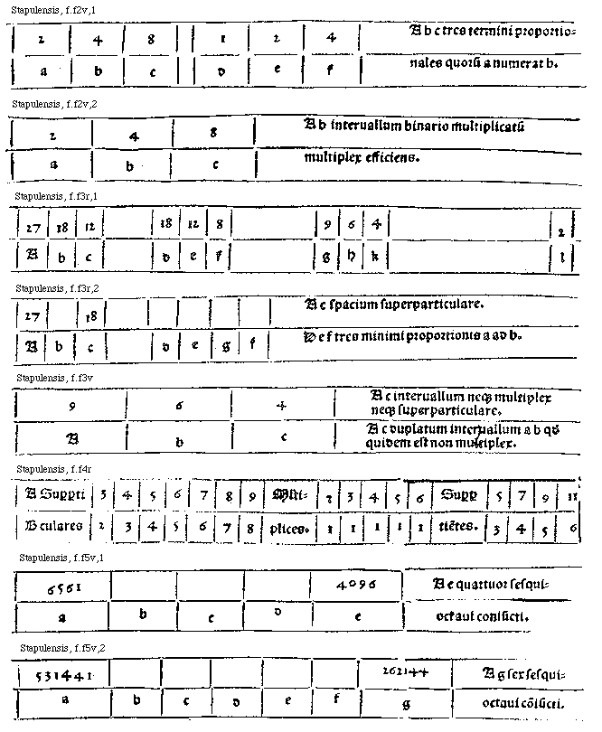 [Stapulensis, f.f2v,1; text: 2, 4, 8, 1, a, b, c, d, e, f, A b c tres termini proportionales quorum a numerat b.] [STAPMUS 02GF]
