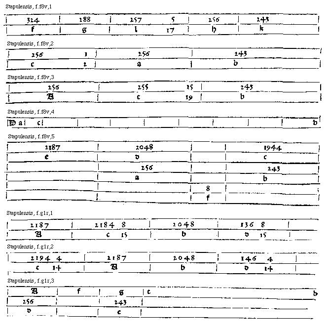 [Stapulensis, f.h3r; text: Proslambanomenos, Hypate hypaton, Parhypate hypaton, Lichanos hypaton, Hypate meson, Parhypate meson, Lichanos meson, Mese, Paramese diezeugmenon, Trite diezeugmenon, Paranete diezeugmenon, Nete diezeugmenon, Trite hyperboleon, Paranete hyperboleon, Nete hyperboleon, A, b, c, d, e, f, g, h, k, l, m, n, o, p, q, 2592, 5971968, 256, 2304, 5308416, 243, 2187, 5038848, 2048, 4718592, 1728, 3981312, 3779136, 3538944, 1296, 2985984, 1152, 2654208, 2519424, 2359296, 964, 2221056, 2108268, 1974272, 648, 1492992, Tonus, Semitonium minus, Semitonium maius, Trisemitonium] [STAPMUS 12GF]