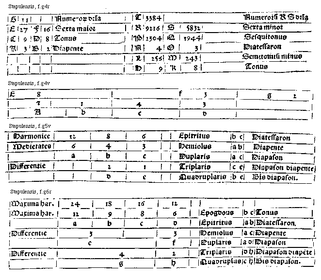 [Stapulensis, f.h3v,2; text: Proslambanomenos, Hypate hypaton, Parhypate hypaton, Lichanos hypaton, Hypate meson, Parhypate meson, Lichanos meson, Mese, Paramese diezeugmenon, Trite diezeugmenon, Paranete diezeugmenon, Nete dizeugmenon, Trite hyperboleon, Paranete hyperboleon, Nete hyperboleon, A, b, c, d, e f, g, h, k, l, m, n, o, p, q, 13824, 12288, 11664, 10368, 9216, 8748, 7776, 6912, 6144, 5832, 5184, 4608, 4374, 3888, 3456, Tonus, Semitonium minus, 11976, 8982, 5988, 4491, diesis, ditonus] [STAPMUS 12GF]