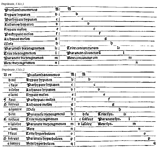 [Stapulensis, f.h3v,1; text: Proslambanomenos, Hypate hypaton, Parhypate hypaton, Lichanos hypaton, Hypate meson, Parhypate meson, Lichanos meson, Mese, Paramese diezeugmenon, Trite diezeugmenon, Paranete diezeugmenon, Nete diezeugmenon, Trite hyperboleon, Paranete hyperboleon, Nete hyperboleon, A, b, c, d, e, f, g, h, k, l, m, n, o, p, q, Tonus, diesis, ditonus, Trite synezeugmenon, Paranete synezeugmenon, Nete synezeugmenon] [STAPMUS 12GF]
