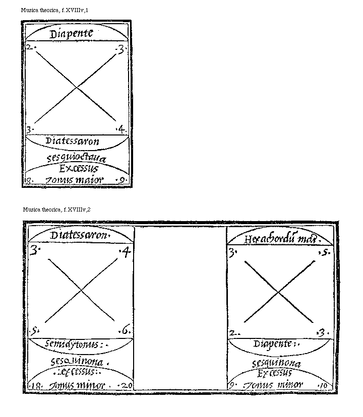 [Musica theorica, f.XVIIIv,2; text: Diatessaron, 3, 4, 5, 6, Semidytonus, sesquinona, excessus, 18, Tonus minor, 20, Hexachordum maioris, 3, 5, 2, 3, Diapente, sesquinona, Excessus, 9, Tonus minor, 10] [FOLMUS2 06GF]