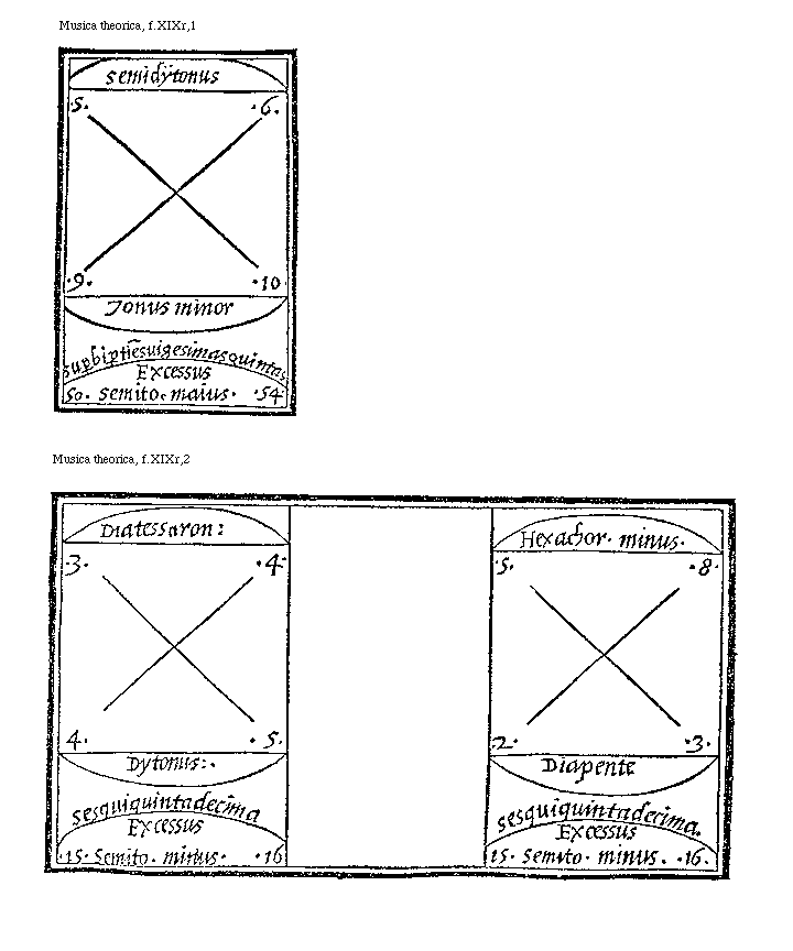 [Musica theorica, f.XIXr,2; text: Diatessaron, 3, 4, 4, 5, Dytonus, sesquiquintadecima, Excessus, 15, semitonium minus, 16, Hexachordum minus, 5, 8, 2, 3, Diapente sesquiquintadecima, Excessus, 15, semitonium minus, 16] [FOLMUS2 07GF]
