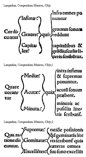 [Lampadius, Compendium Musices, f.Bijv,2, text: Qua ratione dicuntur. Supremae? Geminatae? Excellentes? ratione positionis quod geminatis literis scribuntur quia caeteras omnes suo sono excellunt] [LAMCOM 01GF]