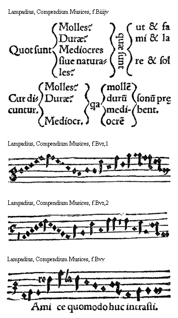 [Lampadius, Compendium Musices, f.Biiijv; text: Quot sunt, Molles? Durae? Mediocres siue naturales? quae sunt, ut et fa, mi et la, re et sol, Cur dicuntur. Mediocres, quia, mollem, durum, mediocrem, sonum praebent] [LAMCOM 03GF]