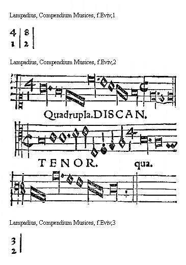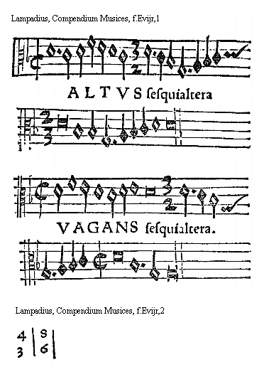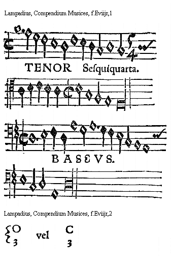 Quomodo construitur sesquiquarta? quum quinque notulae, contra quatuor, eiusdem speciei, ponuntur, signaturque sic. [f.Eviijr] [Lampadius, Compendium Musices, f.Eviijr,1; text: 5, 4, TENOR Sesquiquarta. BASSVS.] [LAMCOM 31GF]