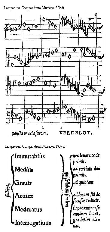 [Lampadius, Compendium Musices, f.Gviv; text: scilicet, Immutabilis, Medius, Grauis, Acutus, Moderatus, Interrogatiuus, qui syllabam finalem, nec leuat nec de primit. ad tertiam deprimit. ad quintam, ad locum sui de scensus reducit. in proximam secundam leuat. gradatim eleuat.] [LAMCOM 44GF]