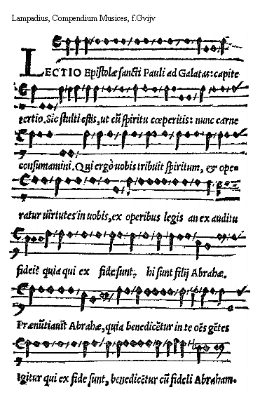 [Lampadius, Compendium Musices, f.Gvijv; text: LECTIO Epistolae sancti Pauli ad Galatas: capite tertio. Sic stulti estis, ut cum spiritu coeperitis: nunc carne consumamini. Qui ergò uobis tribuit spiritum, et operatur uirtutes in uobis, ex operibus legis an ex auditu fidei? quia qui ex fide sunt, hi sunt filij Abrahae. Praenuntiauit Abrahae, quia benedicentur in te omnes gentes, Igitur qui ex fide sunt, benedicentur cum fideli Abraham.] [LAMCOM 45GF]