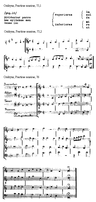 [75] [Oridryus, Practicae musicae, 75,1; text: /pag.16/ Dividuntur porro hae syllabae seu voces in: superiores, la, sol, fa, inferiores, mi, re, ut] [ORIPRA 03GF]