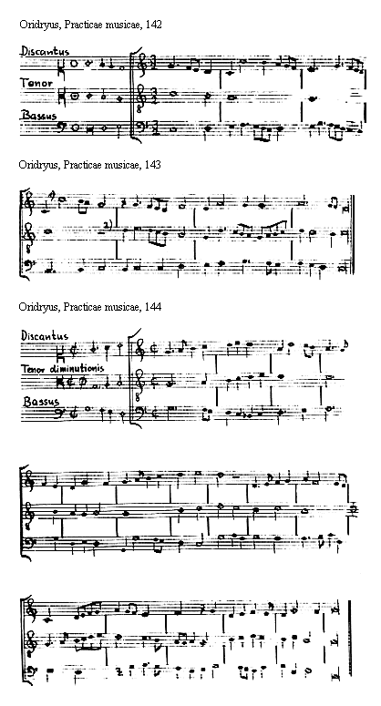 [Oridryus, Practicae musicae, 144; text: Discantus, Tenor diminutionis, Bassus] [ORIPRA 32GF]
