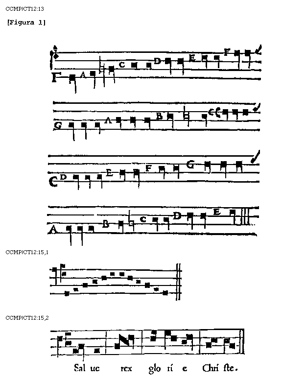 Omnis igitur antiphona finem in D grave collocans ac prima sui [53] "Saeculorum," aut, ut dicunt, EUOUAE (nihil enim repraesentat EUOUAE nisi "Saeculorum Amen," sunt enim omnes eius vocales causa brevitatis in unum collectae hoc modo: Prima vocalis de EUOUAE est E, quae vult denotare Se, U cu, O lo, U rum, A A, E men), voculam in A acuto ponens, dicendo in notulis re la, non dubium est quin sit autentica et de primo tono, ut in Antiphona, "Primum quaerite regnum Dei," cum similibus.