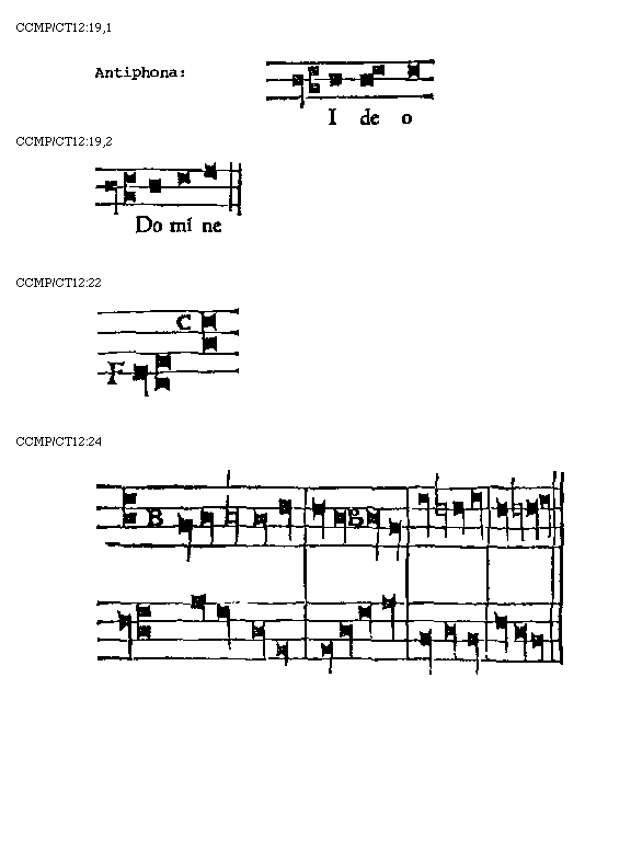 Principia in F, ut Offertorium, "Portas coeli," et vix exempla reperies, in G, [ut Introitus, "Puer natus," in A] ut Introitus, "Eduxit eos Dominus," et raro invenies, ut Communio, "Domus mea," in C acuto, ut Antiphona, "Benedicta filia," in D acuto, ut Antiphona, "Sit nomen Domini benedictum," in [sqb] secundo acuto, ut Antiphona, "Dixit Dominus Domino meo." Possunt autem species eius terminare in omnibus suis principiis et in E et G acutis. His sequitur in figura "Gloria Patri" responsoriorum in D la sol re:
