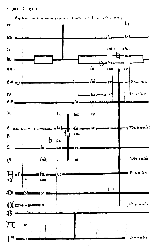 [61] [Rutgerus, Dialogus, 61; text: Septem cantuum concurrentia. lucide et bene ordinata; [Gamma], A, B, C, D, E, F, G, a, b, c, d, ee, ff, gg, aa, cc, dd, ut, re, mi, fa, sol, la, duralis, mollis, naturalis] [RUTDIA 01GF]