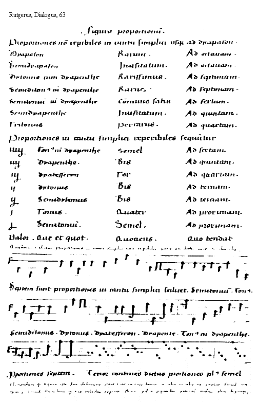 [63] [Rutgerus, Dialogus, 63; text: Figura proportionum. Proportiones non reperibiles in cantu simplici usque ad dyapason. Demidyapason, Dytonus cum dyapenthe, Semiditonus, Semitonium, Semidyapenthe, Tritonus, Rarum. Inusitatum. Rarissimus. Rarus. Comune satis, Perratus. Ad octauam. septimam. sextam. quintam. quartam. Proportiones in cantu simplici reperibiles sequitur, iiii1/2, iii1/2, ii1/2, ii, i1/2, i, 1/2, Tonus, dyatesseron, Semidytonus, Semel, Bis, Ter, Quater, tertiam, prorimam. Valor. Que et quot. Quotiens. Quo tendat, Septem sunt proportiones in cantu simplici scilicet. dyapente. Proportiones septem. Tenor continens dictas proportiones plus semel] [RUTDIA 02GF]