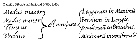 [Madrid, Biblioteca Nacional 6486, f.46v; text: Modus maior, Longarum in Maximis. Modus minor, Breuium in Longis. Tempus est mensura Semibreuium in Breuibus. Prolatio, Minimarum in Semibreuibus.] [STOMTP 01GF]