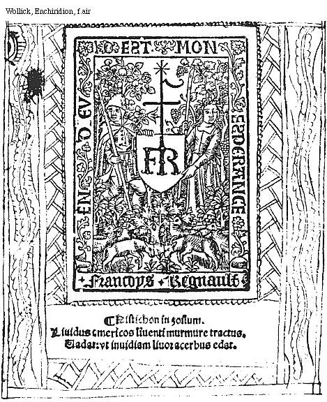 [Wollick, Enchiridion, f.air; text: EN DEV EST MON ESPERANCE, Francoys Regnault, Distichon in fossum, Liuidus omericos liuenti murmure tractus, Uadat: vt inuidiam liuor acerbus edat] [WOLENC1 01GF]