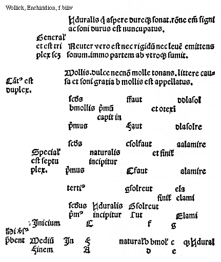 [f.biiiv] [Wollick, Enchiridion, f.biiiv; text: [sqb] duralis qui aspere dure quam sonat. ratione enim signi ac soni durus est nuncupatus. Generalis et est triplex scilicet, Neuter vero est nec rigidum nec leuem emittens sonum. immo partem ab vtroque sumit. Mollis. dulce necnon molle tonans. littere causa et soni gratia b mollis et appellatus. Cantus est duplex. Specialis est septuplex. secundus, ffaut, ddlasol, bmollis, et orexi, primus, primum capit in, Faut, dlasolre, csolfaut, aalamire, naturalis incipitur, et finitur, Cfaut, alamire, tertius, gsolreut, ela, et finitur, elami, [sqb]duralis, Gsolreut, incipitur, [Gamma]ut, Elami, Inicium, C, f, g, Hi versus prebent, Medium Finem, In F, A, naturalis b b mollis, c, que [sqb] dural, d, e] [WOLENC2 02GF]