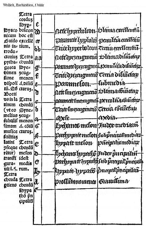 [f.biiiir] [Wollick, Enchiridion, f.biiiir; text: Dyaconicum, Guidonis introductorium Pythagorea dimensione dispositum. Quod Boetius in latinum (vt eo melius subtilissimam musice scientiam latini consequerentur) transfigurauit in quinto Tetrachorda partiens, Tetracordum Hyperboleon hoc est excellentium. e, dd, cc, bb, Netehyperboleon, Paranetehyperboleon, Tritehyperboleon, Vltima excellentium, Penultima excellentium, Tertia excellentium, Tetrachordum Dyezeugmenon id est disiunctarum. aa, g, f, d, Netedyezeugmenon, Paranetedyezeugmenon. Tritedyezeugmenon, Parameson. Netesinezeugmenon, Vltima disiunctarum, Penultima disiunctarum, tertia disiunctarum, submedia, Vltima coniunctarum, Tetrachordum Synezeugmenon id est coniunctarum. c, b, a, G, Parenetesinezeugmenon, Tritesinezeugmenon, Mese, Lychanos meson, Penultima coniunctarum, Tertia coniunctarum, Media, Iudex mediarum, Tetrachordum meson idest mediarum, A, C, D, E, B, Parhypatemeson, Hypate meson, Lychanos hypathon, Parhypate hypathon, Hypate hypaton, subprincipalis mediarum, Principalis mediarum, Iudex principalium, subprincipalis principali, principalis principalium, Tetrachordum Hypathon principalium, a, c, Proslambanomenos, Grauissima] [WOLENC2 03GF]