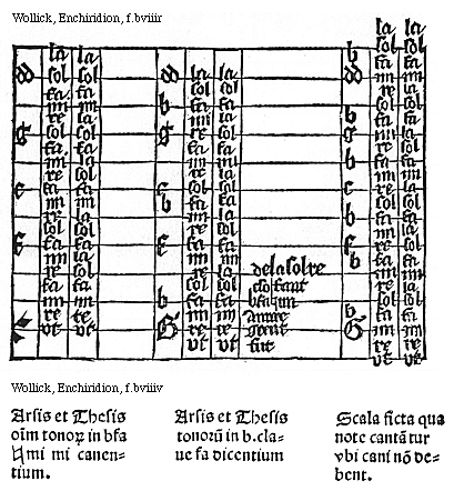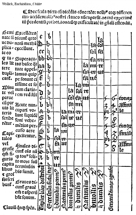 [f.biiiiv] [Wollick, Enchiridion, f.biiiiv; text: Hec scala dicta cum dicendis connectens: nominibus atque differentiis accidentalibus nostri claues nuncuparunt. necnon experimentum precedentium prebet. tonorumque difficultatem in generali ostendit, Geminate siue duplicate eo quod tales littere duplicantur. Minute vel parue cum paruis litteris scriberentur. Capitales vel grosse quoniam figuris capitalibus et grossis scribuntur. Excellentes dicuntur quia tonorum methan excellunt. c, dd, cc, b, [rob], [sqb], la, sol, fa, Superacutas hasce quattuor appellamus quippe sonant citissime et sonum clariorem reddunt, aa, g, f, e, d, c, mi, re, ut, 5, 6, tonorum, Acute nuncupari volunt siquidem soni vehementius percusso aere excitentur, b[sqb], a, G, F, B, D, 3, 4, 7, 8, aFinale, Finale, Finales dicuntur omnis namque tonus solito more suum terminum in his sumit. C, Graues dicuntur grauem enim et asperum habent sonum. Clauium quinque species. Triplex litterarum distributio, Ecce scala ficta, [sqb] duralis primus, Naturalis primus, bmollis primus, [sqb] duralis secundus, Naturalis secundus, bmollis secundus, [sqb] duralis tertius, Generalis tonorum agnitio, primus, secundus] [WOLENC2 04GF]