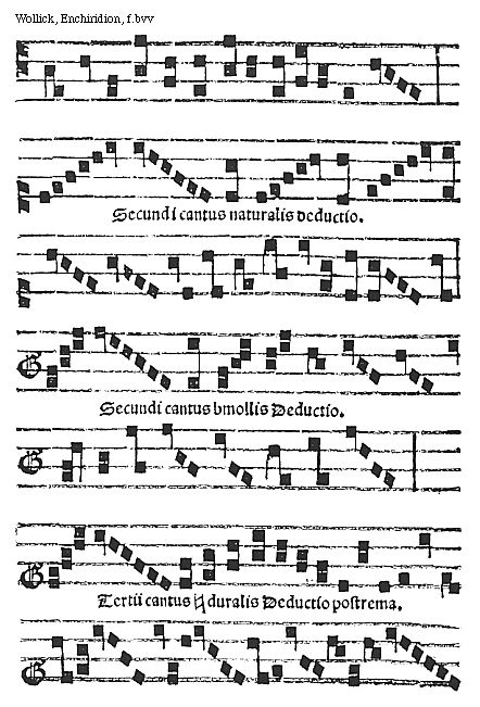 [f.bvv] [Wollick, Enchiridion, f.bvv; text: Secundi cantus naturalis deductio. Secundi cantus bmollis Deductio. Tertii cantus [sqb] duralis Deductio postrema] [WOLENC2 06GF]