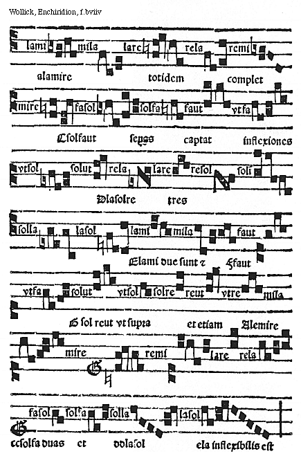[Wollick, Enchiridion, f.bviiir; text: dd, g, c, f, b, B, G, la, sol fa, mi, re, vt, delasolre, csolfaut, bfa[sqb]mi, amire, greut, fut] [WOLENC2 10GF]