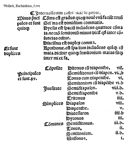 [Wollick, Enchiridion, f.cvr; text: Interuallorum distributio sequitur. Minus principales et sunt quinque, Comma est gradus quorum nouem vnum faciunt tonum, Sci ma est dimidium commatis. Dyesis est spacium includens quattuor commata. necnon semitonium minus dicitur quod inter coniunctas oritur. Diacisma est duplex comma. Et sunt duplices, Apothome. est spacium includens quinque commata. dicitur quoque semitonium maius fitque inter mi et fa. Principales et sunt. xv. Composite, Ditonus cum diapenthe. vii. Semiditonus cum diapente. vii.b, Tonus cum diapenthe. vi. Semitonium cum diapenthe vi.b. Inusitate, Semidiapason viii.b. Semidiapenthe v.b. Tritonus iiii. Simplices, Diapason viii. Diapenthe v. Diatessaron iiii.b, Dytonus iii. Communes, Semiditonus iii.b. Tonus. ii. Semitonium. ii.b. Unisonus i.] [WOLENC2 16GF]