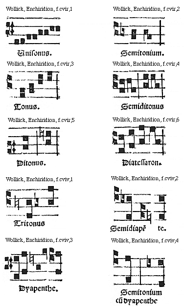 [Wollick, Enchiridion, f.cviir,3; text: Ter terni sunt modi quibus omnis cantilena contexitur scilicet, vnisonus, semitonium, tonus, semiditonus, ditonus, diatessaron, diapenthe] [WOLENC2 18GF]